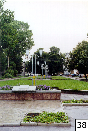 38. Здесь стоял прежде памятник Шенкендорфу. На переднем плане видна памятная доска в честь русских солдат, жителей Советска, которые погибли после Второй Мировой войны за пределами России (например в Афганистане). На заднем плане справа и слева видны старые немецкие здания. В доме слева жил священник Ландкирхи (надстроен третий этаж). Ныне здесь размещается детский сад. Frueher stand hier Schenkendorf-Denkmal. Foto im September 2000. Im Vorder- grund liegt eine Denktafel zu Ehren der russischen Soldaten, die im Ausland (z.b. in dem Afganistan) ungekommen sind. In der Ferne links und rechts liegen alte deutsche Gebaeude. Links war frueher ein Pfarrershaus der Landkirche, in dem heute befindet sich Kindergarten. | ||||||