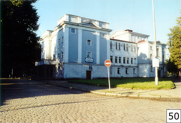 49. Городской театр был построен в 1893 году после внесения на его строительство значительной суммы Августом Энгельсом. Строительство театра обошлось в 145 тысяч марок. До этого театральное здание размещалось на земельном участке по Deutsche Strasse №27 (примерно между швейной фабрикой и рынком), в котором потом размещалась гарнизонная церковь, а позднее гарнизонная школа. Фотография театра до 1935 года. В 1935-36 годах театр был обновлен. Наружные скульптуры и другие украшения при этом были удалены. 1893 wird das Stadttheater auf dem Anger fertiggestellt, nachdem der Rentner August Engels der Stadt eine beachtliche Summe zum Bau eines wuerdigen Theaters vermacht hatte. Der Theaterbau hat 145 000 Mark gekostet. Zuvor gab es ein Theatergebaeude auf dem Grundstueck Deutsche Strasse No.27 das zunaechst als Garnisonkirche und spaeter als Garnisonschule diente. (Zwischen heutige Kleiderfabrik und Stadtsmarkt). Foto vor 1935. 1935/1936 unter Entfernung des allzu ueppigen Bauschmucks renoviert wurde.