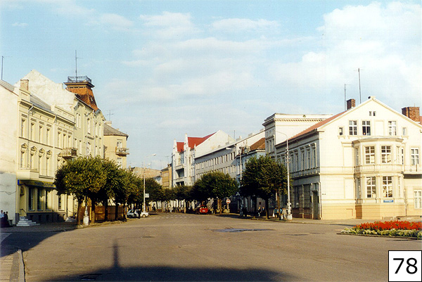 78. Тот же вид в сентябре 2000 года. Третье справа здание построено на месте разрушенных во время войны домов. В первом справа доме находятся детская художественная школа и концертный зал детской музыкальной школы. На первом этаже долгие годы помещалась сберегательная касса. Сейчас она переместилась в специально для сбербанка построенное здание на улице Гончарова, угол улицы Искры. Die Landschaft im September 2000. Das dritte Gebaeude von rechts ist neu. In dem ersten von rechts gebaeude unterkommen heute die Kinderkuenstlerschule und das Konzerthalle der Kindermusickschule und auch die Abteilung des Russische-Deutsch Hauses. Viele Jahre nach dem Krieg fand sich hier am Erdgeschoss eine Stadtsparkasse. | ||||||