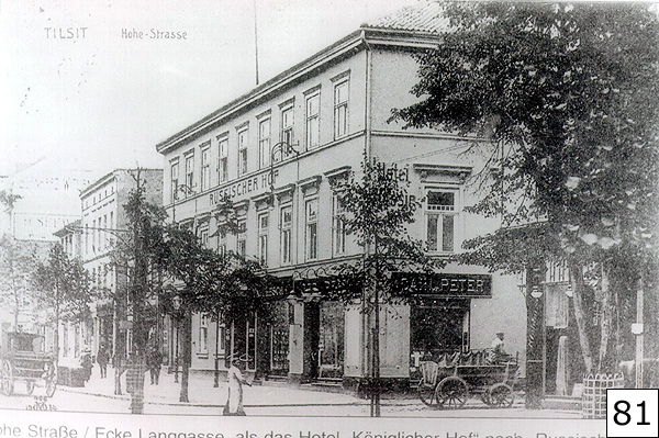 81. Перекресток улиц Победы (Hohe Strasse) и Гончарова (Langgasse). На 2 и 3 этажах здания в центре был отель "Russischer Hof" ("Русский двор"). На первом этаже здания справа от отеля был магазин готового платья. Hohe Strasse, Ecke Langgasse. Hotel